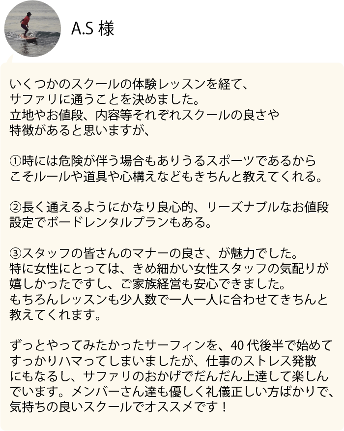 サーフィンという未知の体験をする時は、少し勇気が必要でしたが、SURFARIを選んで本当に良かったです。